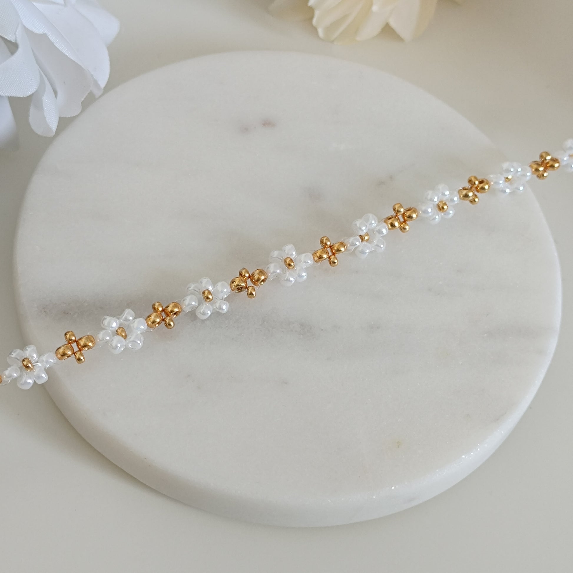Plonge dans un univers de dĂ©licatesse et de raffinement avec le Sparkling Daisy, une crĂ©ation oĂč le dorĂ© et les perles sâentrelacent pour sublimer ton poignet. InspirĂ© par la beautĂ© des fleurs de marguerite, il capture toute la poĂ©sie dâun jardin ensoleillĂ©.
