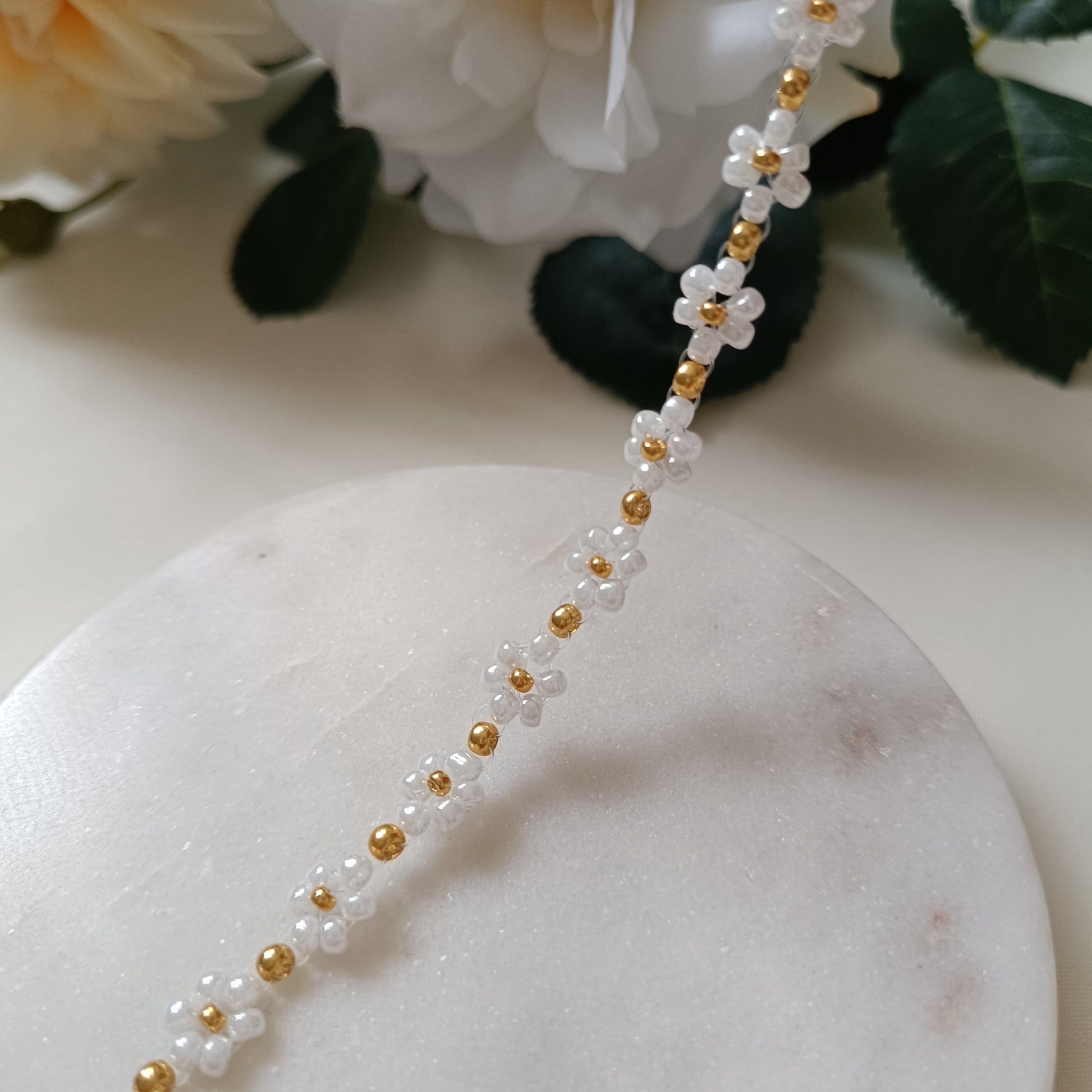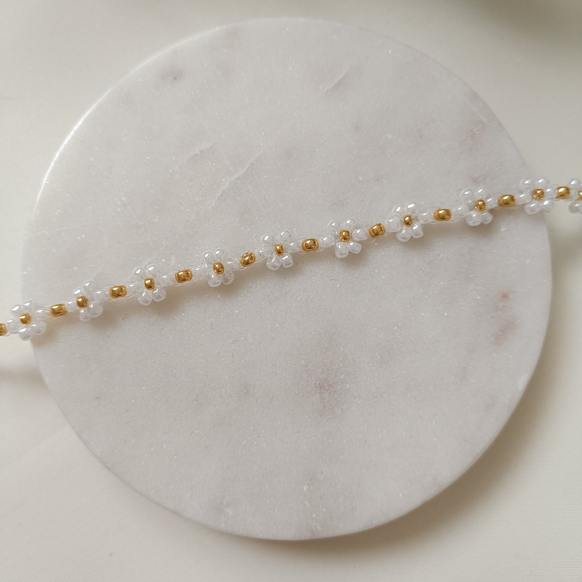 Laisse-toi sĂ©duire par le charme du bracelet Daisy : un bijou dorĂ©, dĂ©licatement ornĂ© de petites fleurs et de perles brillantes, qui rappelle la douceur dâun champ de marguerites sous le soleil. LĂ©ger, lumineux, plein de fraĂźcheur : parfait pour faire rayonner ton style.