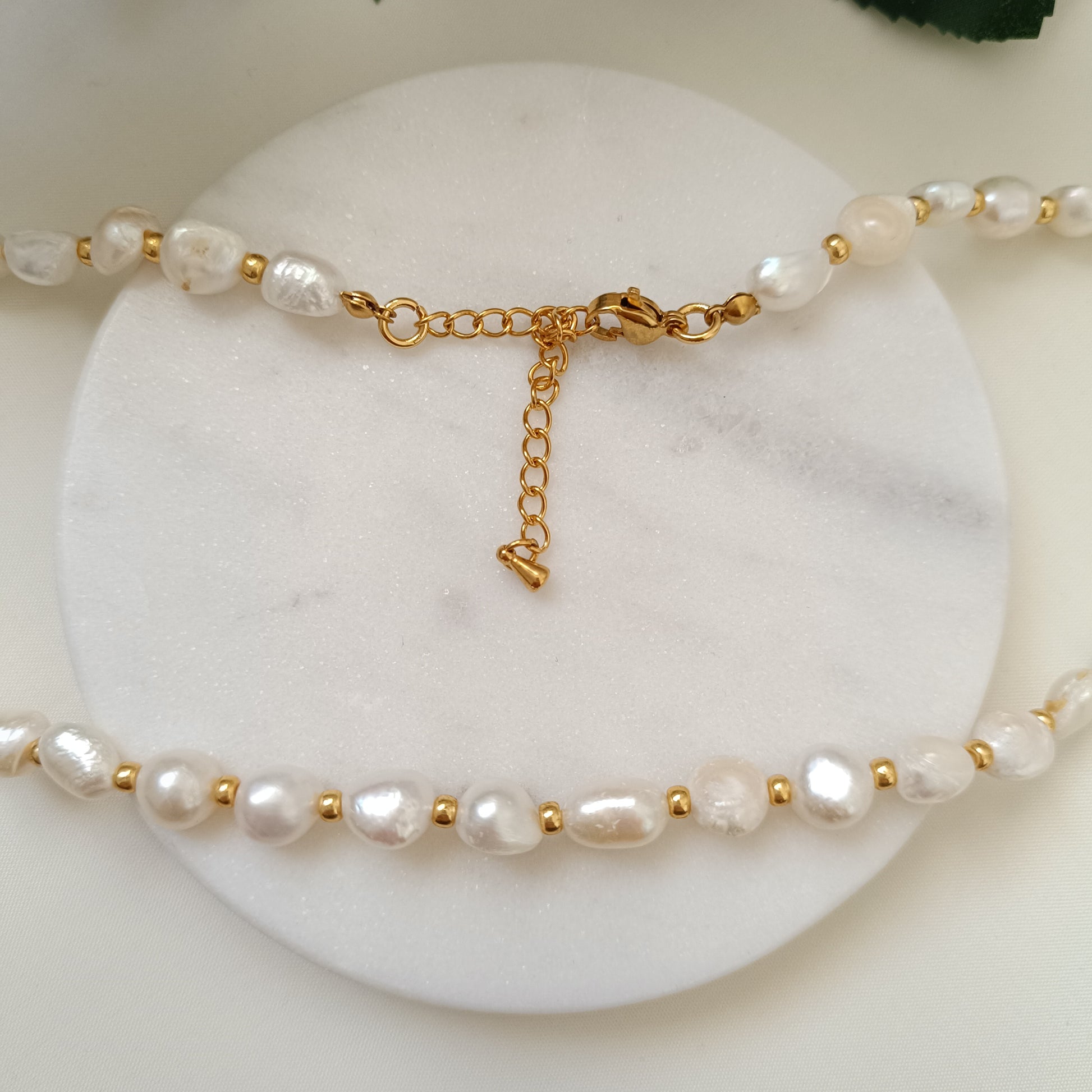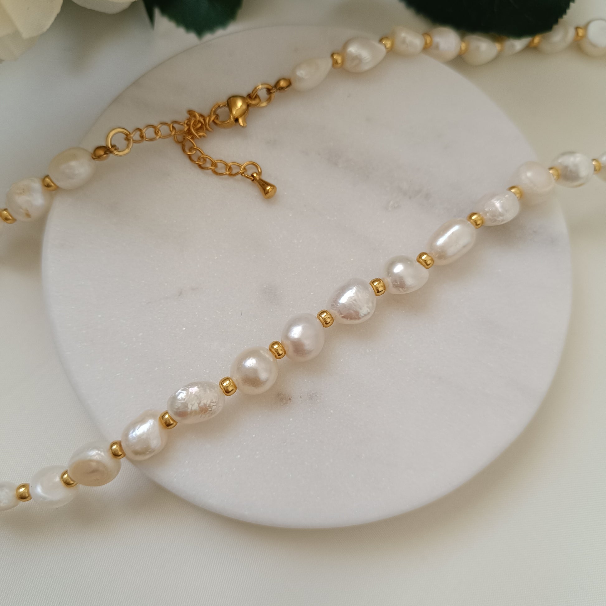 Le collier "Eve" célèbre la beauté naturelle avec l’éclat nacré des perles d’eau douce, alternées avec de délicates perles dorées. Chaque perle, façonnée par la nature, reflète une lumière douce et subtile, symbole de grâce et de raffinement. L’association du nacre et des touches dorées crée un équilibre parfait entre élégance classique et modernité, faisant de ce collier un incontournable pour illuminer votre style au quotidien.