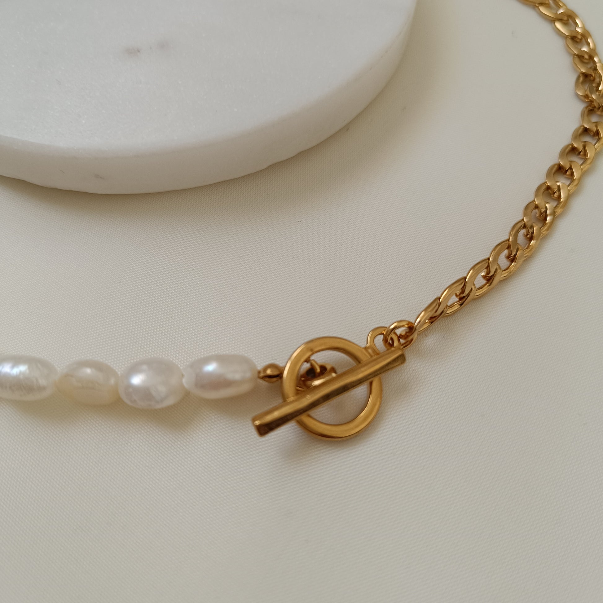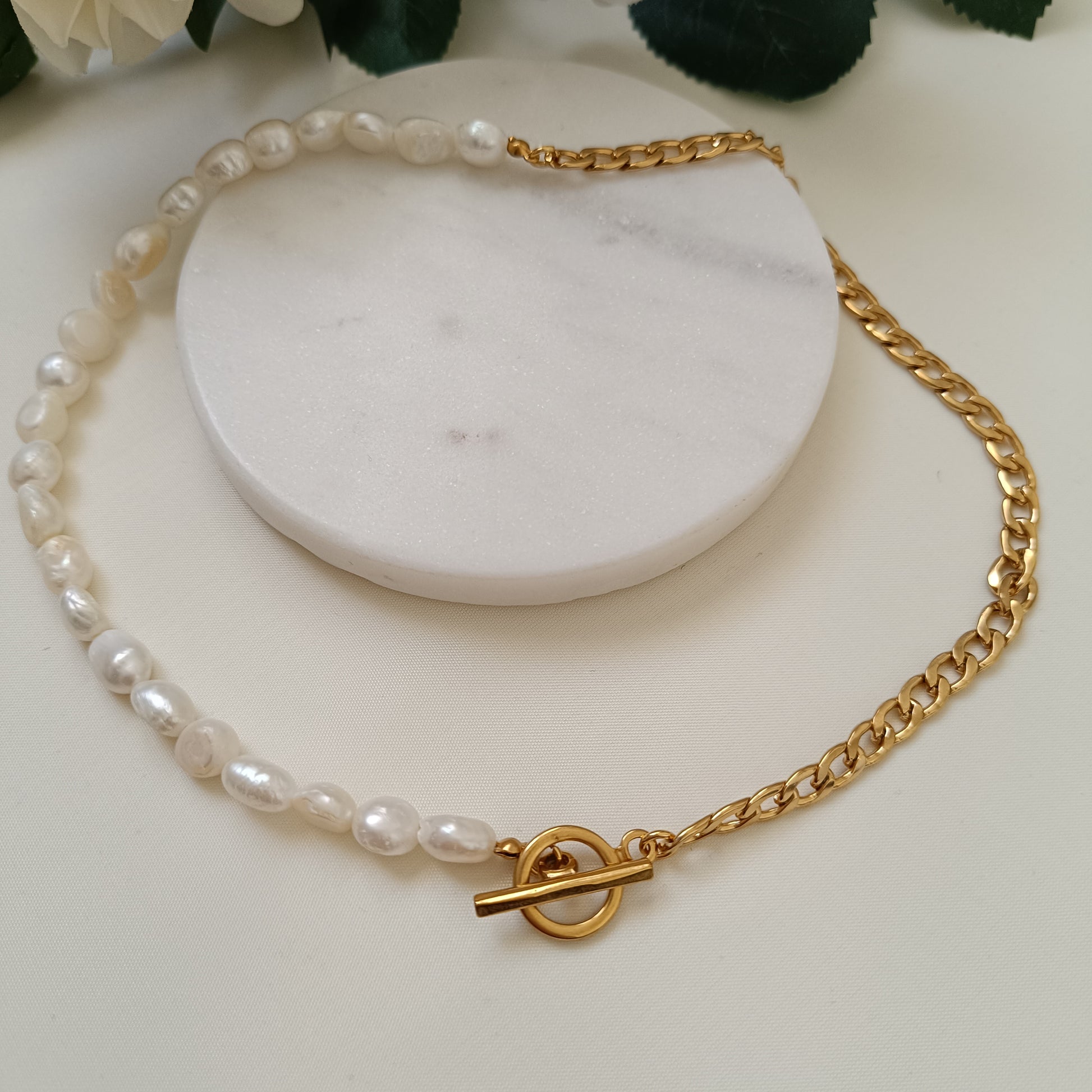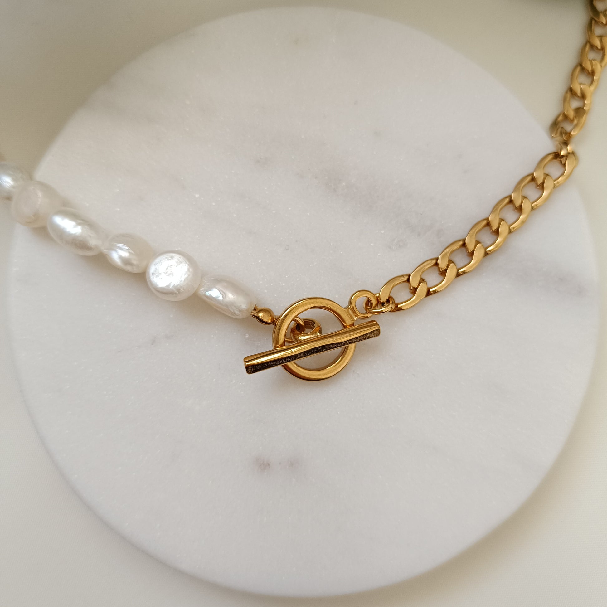 ĂlĂ©gance et modernitĂ© se rencontrent dans "Symbiose", un collier qui marie avec finesse la puretĂ© des perles dâeau douce et lâĂ©clat dâune chaĂźne en acier inoxydable. Son design Ă©purĂ©, sublimĂ© par un fermoir en T dĂ©licat, en fait une piĂšce essentielle pour celles qui recherchent un bijou chic et minimaliste.