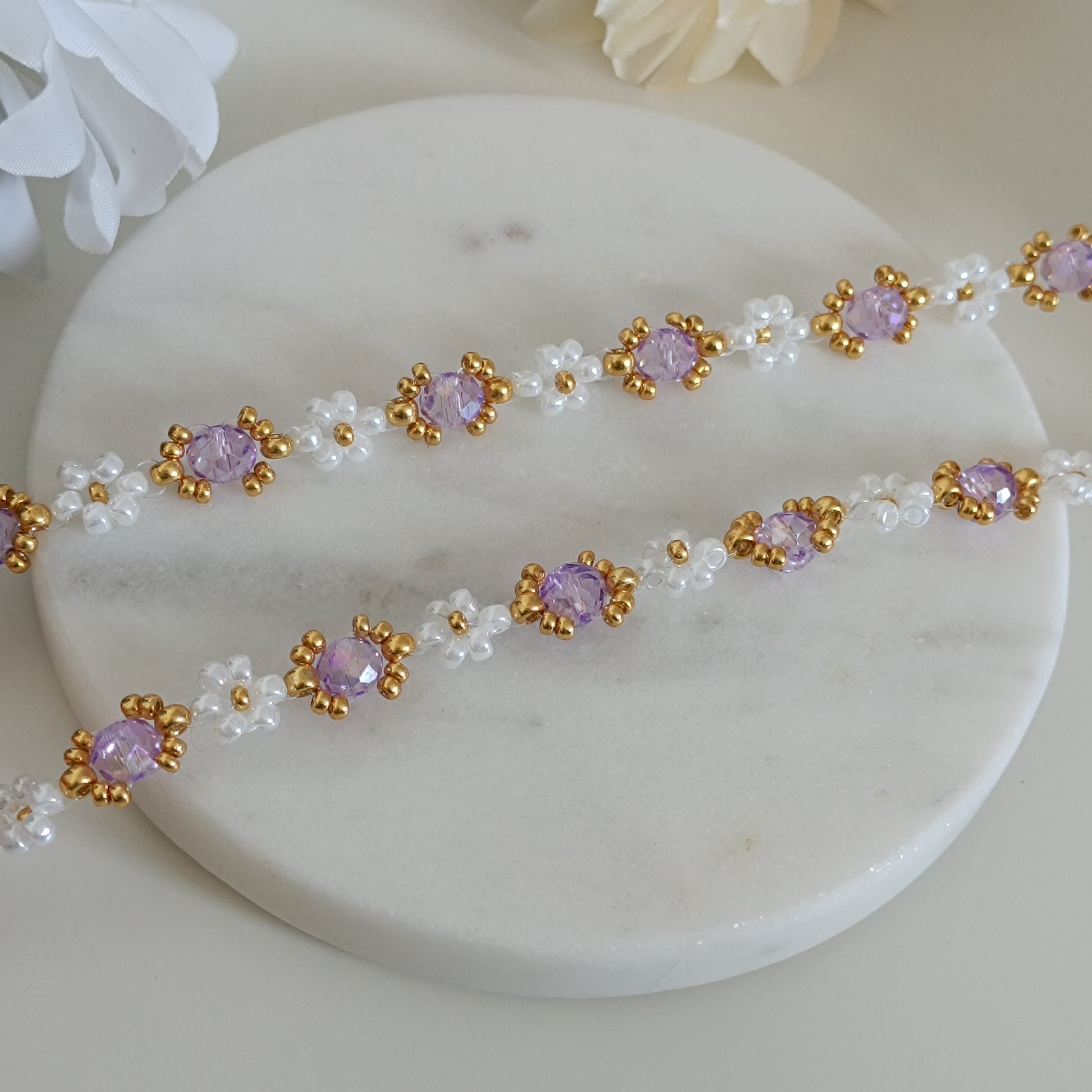 Orné de perles aux reflets violets et de détails dorés sophistiqués, ce collier évoque la beauté d’un champ de violettes. Son design fin et intemporel se marie parfaitement avec une tenue romantique, bohème ou chic.